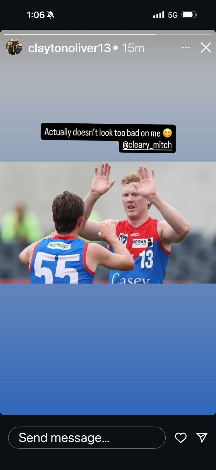 Oliver tweeted a photo of himself in a Casey Demons jersey.