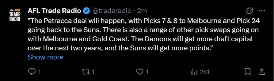 This nets them Petracca for picks in a perceived weaker draft, and the option to trade in a stronger draft market, with potentially more than just one suitor.