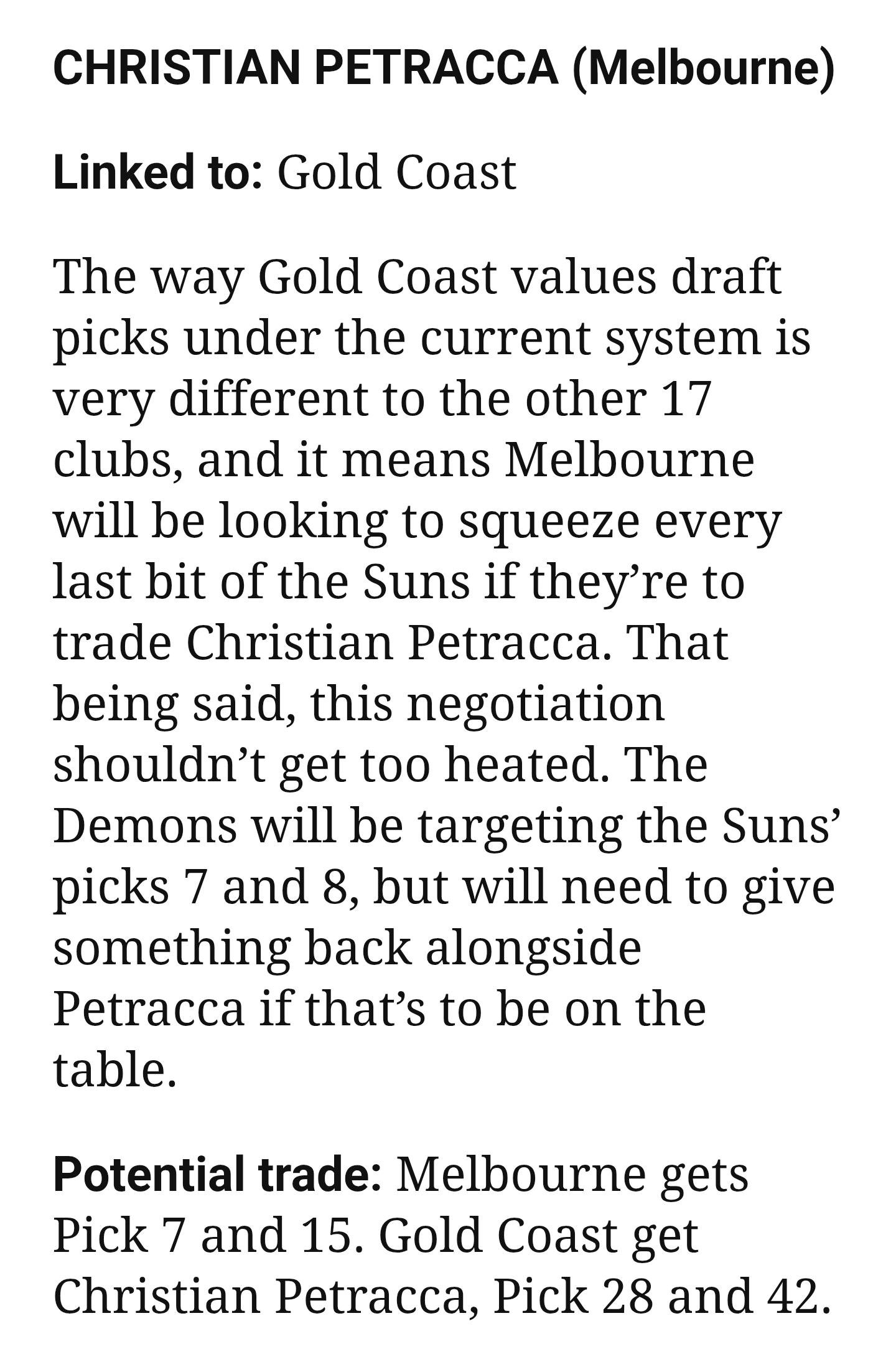The SUNS get Petracca and our pick 28 and 42 we get pick 7 and 15 . Basically 3 picks for 2 picks in the SUN'S favour , you gotta be NUTS.