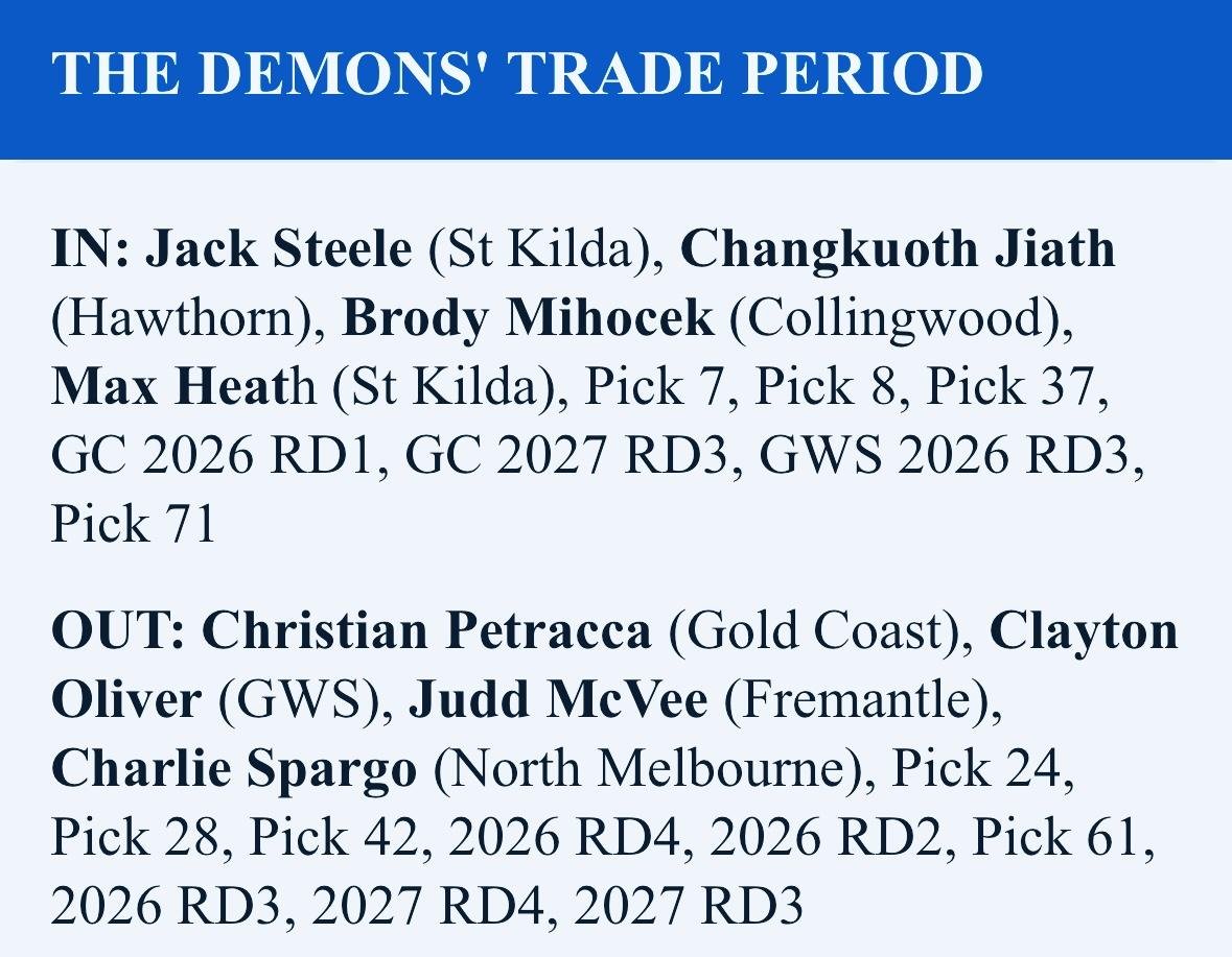 The loss of Oliver and Petracca will be significant, but Melbourne has bolstered its roster with key additions, including Brody Mihocek, Jack Steele, Changkuoth Jiath, and Max Heath. These players bring a mix of leadership, specialized skills, and high standards, which will be crucial in the club's future success. The counterweight is the story of St Kilda captain Jack Steele, who the club acquired on the final day of the trade period, but more on that later. Steele joins the club with a similar price tag to that of Oliver but his story is very different and will be covered in the next chapter of this story.