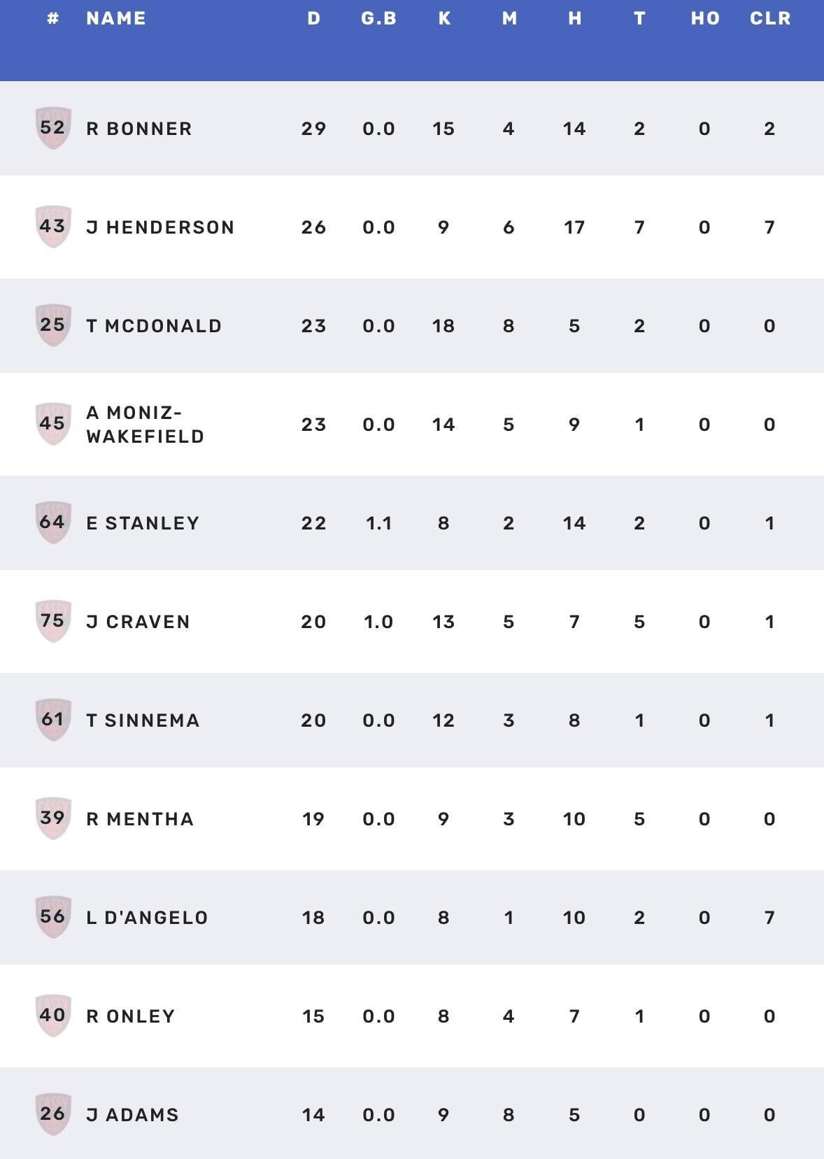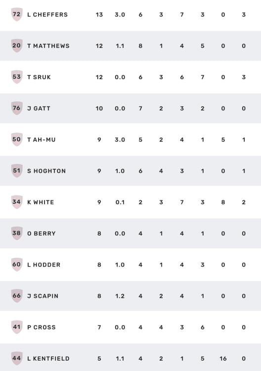 Max is still well ahead in the leading trio but some extra names entered the picture this week. Progressive voting ... 82. Max Gawn 64. Kysaiah Pickett 58. Jack Steele 24. Harvey Langford 19. Tom Sparrow 17. Ed Langdon Jake Lever Jacob van Rooyen 14. Kade Chandler Christian Salem 11. Bayley Fritsch Koltyn Tholstrup 8. Jai Culley 7. Brody Mihocek 5. Jake Melksham Trent Rivers 3. Daniel Turner 1. Harrison Petty Harry Sharp