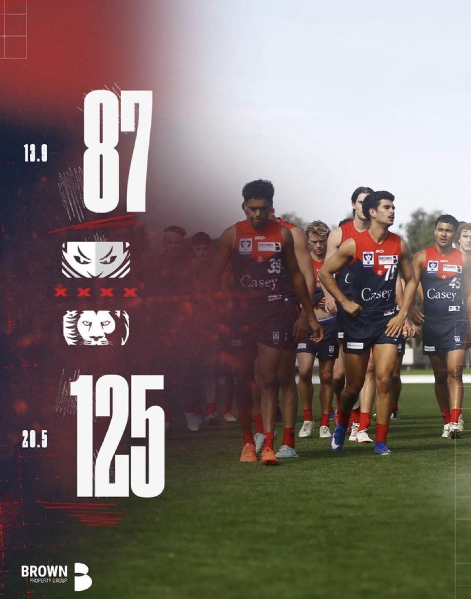 OUT-BUSTLED by KC from Casey From the outset, the Casey Demons lacked any spring in their steps. They were out-hustled and out-bustled and finally outplayed by the Brisbane Lions by 38 points on their home turf in perfect conditions at Casey Fields. It was never going to be easy for the Demons, who are a young and inexperienced combination left with very little in the way of big-man strength in the absence of Max Heath, promoted to the AFL, and Tom Campbell, out injured. Similarly, their key forward stocks were diminished with Matt Jefferson playing at Melbourne, Aidan Johnson on the injury list, and Luker Kentfield seconded into a raw, makeshift, and undersized ruck after Nate Pipicelli’s late withdrawal. The result was virtually inevitable against the Brisbane Lions, a power of the competition in recent seasons but who had lost their two opening matches in their home state. They opened the game with great vigor. They made space ran with the ball kicked accurately both around the ground and in front of goal while the Demons, beaten at the stoppages were sloppy and forced into error. The Lions opened up a five goal lead by time while the home team remained goalless. There was a brief period of revival early in the second term after Luker Kentfield opened with a goal within seconds, to which the Lions immediately responded. Then came a Casey purple patch with two quick goals from Luke Cheffers followed up by two more youngsters in Jobe Scapin and the lively Tom Matthews chipping in for opportunist goals and suddenly there was hope. The deficit had been narrowed to 15 points in the space of a few minutes. It was the Lion machine that revved itself up and blew the game apart with four unanswered goals to go into the sheds at the major interval with a solid 37-point lead. From there it was a procession until the sting went off the game and Casey clawed back a little dignity at the end of the game. For the most part, the Lions played with greater intensity and in doing so, they made the play. The Demons left too many opponents unguarded so that even when they made an error and miskicked, there was always someone else to gather the football. When the ball went forward for Casey, the visitors always seemed to have a defender in position to cut off the ball movement. Casey’s problems were not helped by the fact that Paddy Cross had to leave at half time to take up emergency duty at the MCG after a reasonable stint working hard with some strong tackling. With his departure, the Demons were left with ten mostly inexperienced foot soldiers, the exception being Tom McDonald who played his heart out, as he always does, picking up 23 possessions and taking eight marks. Jack Henderson, with 26 disposals, seven tackles and seven clearances, Andy Moniz-Wakefield had 23 touches, and Ricky Mentha Junior 19 possessions coming out of defence were impressive. Mentha Jnr was particularly strong early while Tom Matthews was lively and courageous, taking a few hits along the way. Kentfield who is being touted as the club’s potential next AFL debutant managed 16 hitouts but, apart from his goal did little damage. He was assisted in the ruck by lightly built Kalani White who looked like he was being carefully managed on return from a bout of glandular fever. Jed Adams, Oscar Berry and Riley Onley had tough assignments in defence with Adams taking some strong saving marks. Skipper Riley Bonner was again the top possession winner with 29 disposals, capably backed up by Ethan Stanley, Jesse Craven and two up a coming youngsters in Toby SInnema and Luke Cheffers who finished with three goals. Last minute inclusion Tairon Ah-Mu contested hard up forward and in the ruck and was also rewarded with three goals. The Casey contingent is young and will improve with time as they acclimatize to the tempo of the game. The Demons sit uncomfortably near the foot of the table and will be desperate for an infusion of experience into its ruck and midfield stocks if it is to play a meaningful role in this season’s VFL action. Their next opponents are Richmond’s VFL side at Casey Fields on Anzac Day. CASEY DEMONS 0.4.4 4.7.31 9.7.61 13.9.87 BRISBANE LIONS 5.2.32 11.2.68 17.4.106 20.5.125 GOALS CASEY DEMONS Ah-Mu Cheffers 3 Craven Kentfield Hodder Hoghton Matthews Scapin Stanley BRISBANE LIONS McKenna McLachlan 4 Abberley Fazldeen Torrent 2 Beecken Curtin Dunkley Hayes McCarthy Moore BEST CASEY DEMONS Bonner McDonald Henderson Moniz-Wakefield Cheffers Adams BRISBANE LIONS Joyce Marshall Torrent McLachlan Beecken McKenna