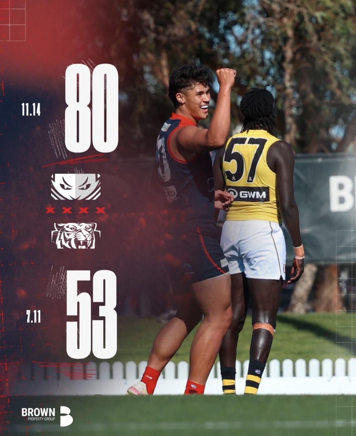 AUTUMN WINDS by KC from Casey The winds finally returned to Casey Fields for the Demons’ third home game of the VFL season, and its impact was immediate. After two opening rounds played in uncharacteristically fine conditions, the Anzac Day clash brought back the familiar gusty conditions that have been a feature of the region at this time of the year. Forced to kick into the breeze first, the slow-starting Demons faced a tricky opening against an enthusiastic young Tigers outfit. Casey responded by turning the contest into a scramble, pressuring Richmond into errors and missed targets. The tactic proved crucial, keeping the game tight for three and a half quarters before the Demons pulled away with the autumn wind at their backs. Richmond wasted early opportunities, and Casey’s slightly better efficiency in front of goal almost gave them a quarter-time lead. A last-minute Richmond major on the siren, however, saw the Tigers take a narrow advantage. The standard didn’t lift much when Casey had the wind in the second term. Richmond controlled the ruck, but the Demons gradually worked their way on top thanks to key forward Tairon Ah-Mu. His strong marking and presence troubled the Tigers, and he finished the half with two valuable goals. The prime mover for Casey was Jake Bowey. Making a successful return from December foot surgery, Bowey played a scheduled half and showed his trademark composure, finishing with 15 disposals, three marks and three tackles. Casey led by eight points at half-time, a slender margin given Bowey would not return. An early goal to Luker Kentfield pushed the lead to a then game high 14 points, but Richmond again surged with the breeze. Three unanswered goals put the Tigers back in front, before Casey’s pressure acts locked the game down for the final 15 minutes of the third. Richmond’s four-point lead at the last change looked vulnerable kicking into a freshening wind that was swirling a little across the face of goal. The Dees took full control in the final term. After a rushed Richmond behind, Casey piled on 4.8 to run out 27-point winners, evoking memories of the days when Casey Fields was a fortress. Andy Moniz-Wakefield has been outstanding on return from injury, racking up 31 disposals and six tackles in this game. Patrick Cross grew into the game and finished with 22 disposals, nine marks and two important goals. Since his return from his sole AFL appearance against Carlton before injury, Cross has lifted another level and is pressing for a further chance. Luker Kentfield provided a strong target with 13 disposals, six marks and two goals. Tom Matthews had a quiet day statistically with nine disposals, but his two last-quarter goals were invaluable. Co-captain Riley Bonner again led by example, whether in defence or on-ball, collecting 27 disposals and five marks. He was well supported by an improved Tyson Sruk with 25 and four. Luis D’Angelo and Toby Sinnema each had 20 touches and provided great service, while Ah-Mu’s bustling presence in attack was vital. The most experienced Demon on the ground, Tom McDonald, was influential early in defence and a pillar late, finishing with 22 disposals and 10 marks. Jed Adams worked tirelessly to plug holes in defence, tallying 12 touches and six marks and helping keep the ball locked in Casey’s forward half in the final term. Jack Henderson and Ricky Mentha Jr had their moments of strong play, while ruckman Kalani White continues to show steady growth. It was an ugly win but it lifts Casey into the middle of the ladder. They face a stern test next Sunday when they travel to Sydney to meet the in-form Swans. CASEY DEMONS 2.3.15 6.5.41 7.6.48 11.4.80 RICHMOND VFL 2.7.19 4.9.33 7.10.52 7.11.53 GOALS CASEY DEMONS Ah-Mu Cross Kentfield Matthews 2 Bonner Scapin SInnema RICHMOND VFL Philp Yassine 2 Ferguson Roberts-Thomson Trainor BEST CASEY DEMONS Moniz-Wakefield Bonner Cross McDonald Ah-Mu Sruk Bowey RICHMOND VFL Hayes-Brown El Nour Sonsie Trainor Connolly Scott