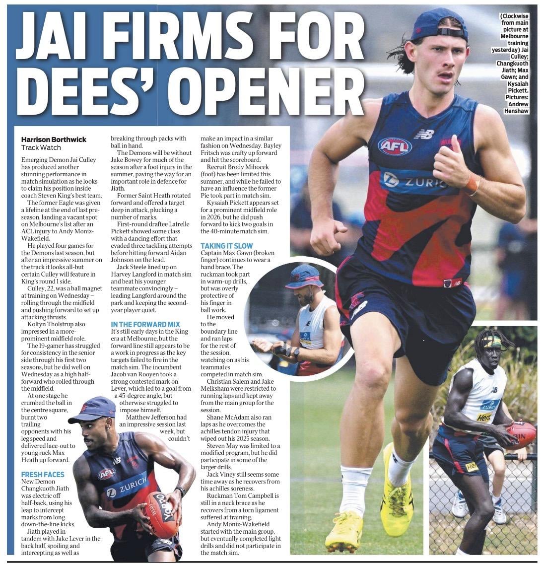 B: Christian Salem, Harrison Petty, Daniel Turner HB: Blake Howes, Jake Lever, Xavier Lindsay C: Ed Langdon, Jack Viney, Caleb Windsor HF: Kozzy Pickett, Brody Mihocek, Jake Melksham F: Kade Chandler, Jacob van Rooyen, Bayley Fritsch Foll: Max Gawn, Harvey Langford, Trent Rivers I/C: Tom Sparrow, Jack Steele, Changkuoth Jiath, Jai Culley, Tom McDonald Emerg: Latrelle Pickett, Koltyn Tholstrup, Steven May, Xavier Taylor Some big-name departures over the off-season have made for a fresh start at the Demons, with the exits of midfield mainstays Christian Petracca and Clayton Oliver opening the door for a new era in the engine room. Defender Trent Rivers and livewire forward Kozzy Pickett are set for increased midfield minutes, while young gun Harvey Langford and recruit Jack Steele are also expected to feature heavily. Jai Culley has been tearing up the track this pre-season, so it wouldn't be a surprise if he earns a spot in the starting 18 come round one, but veteran Jack Viney gets the nod at this stage. With Rivers set to be unleashed into the midfield, a spot starting spot across half-back is up for grabs, with second-year player Xavier Lindsay or recruit Changkuoth Jiath likely contenders. Jake Bowey would be a certain starter, but a Lisfranc injury is expected to sideline him until at least the middle of the season. How the rest of the backline shapes up remains equally intriguing, with an abundance of tall options at Steven King's disposal. The Dees tried to offload Steven May last trade period which suggests he could be down the pecking order at selection, with Jake Lever, Daniel Turner and Harry Petty likely ahead of him. However, Turner and Petty's ability to play forward keeps the door ajar for May if needs arise. Tom McDonald will also be heavily considered. First-round pick Xavier Taylor is unlucky to miss here, but he'll be given ample opportunity in his debut season. - Alison O'Connor- PRESEASON TRAINING: Wednesday 28th January 2026