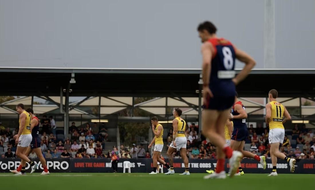 Melbourne saw off Richmond 12.6 (78) to 6.7 (43) in the clubs’ lightning-affected Community Series tune-up in Ballarat on Friday afternoon. Six minutes into the third quarter, with the Dees up 35 points, the match was abandoned after play was halted for the second time due to lightning in the area. The Demons controlled the clash from start to finish, led by Caleb Windsor and Max Gawn, who combined for 18 score involvements. Windsor, a bright spot in Melbourne’s revamped midfield, gathered 15 disposals and kicked a smooth running goal, while Trent Rivers and Changkuoth Jiath were also among the side’s major ball-winners. Tim Taranto collected 19 disposals, while skipper Toby Nankervis added 15 and a team-high six score involvements. The Dees had 10 individual goalkickers, with Jacob van Rooyen leading allcomers with three majors. Tom Lynch made a solid return to Richmond’s senior outfit, booting two goals with five score involvements. Just two minutes and 20 seconds into Friday’s contest at Mars Stadium, play was halted due to lightning in the area. “We did notice this pre-game; it was travelling away from the stadium. Obviously, there’s a little bit more around,” Brad Johnson said on Fox Footy. Nick Dal Santo added: “Just to put that into perspective, 30 minutes ago there was nothing but sunshine. Now, the lightning’s come in extremely quickly.” Rules dictate that if lightning is detected within 10 kilometres of the venue, there is to be a break in play. After a 30-minute spell, the teams returned to the field and play resumed. Developing Melbourne forward Luker Kentfield exited just minutes after the first ball-up with a knee injury after an awkward landing in a marking contest in which he also copped a knock to the head. There was also an injury concern for Tigers’ top-10 draft pick Sam Cumming, who went to the bench before quarter-time holding his right shoulder, which was already strapped. The young midfielder was ruled out of the game in the second quarter, with the Tigers hoping the issue is at the minor end of the scale. Rising Demons star Caleb Windsor was absolutely everywhere in the opening term, running riot for an equal-most 10 disposals, a running goal, and a staggering seven score involvements. He also attended close to every centre ball-up in the first quarter, showing more promise that he can develop into the Dees’ next midfield gem. “He has been magnificent,” Fox Footy caller Dwayne Russell said. Nick Dal Santo added: “What I’ve loved is his work rate, particularly out of contest, his ability to push forward and be really damaging.” Richmond made some inroads on its deficit early in that second term, but its momentum was short-lived as Melbourne kicked the last two goals of the first half to lead by 37 points at the main change. Tim Taranto led all with 18 first-half possessions, while Windsor had nine score involvements as the Dees already had nine individual goalkickers. Jacob van Rooyen kicked a game-high three goals in promising signs. Melbourne had 12 more inside-50s than the Tigers at the half and looked far more threatening in transition, with Richmond consistently sloppy with ball in hand. Almost halfway through the third quarter, play was once again halted due to more lightning in the area. “If it gets too dark, they might consider calling the game off,” caller Dwayne Russell said. Brad Johnson added: “That’s right, because they don’t have the lighting here to be able to keep this game going. So, there will be some discussions being had between the clubs with the AFL officials with regards to what the remainder of this game looks like.” And a few short minutes later, league officials made the call to abandon the match with the Dees ahead almost six goals. The 3-2-1 (what we learned) ... 3. NEW-LOOK DEES CONTINUE TO SHINE In a scratch match against North Melbourne last week, Kysaiah Picket was so dominant he would have picked up not just the three votes, but every vote had they been on offer. During what has been a pleasing pre-season for Melbourne under new coach Steven King, it was left to other young Demons to shine in what is a new look midfield. Caleb Windsor was a driving force from the middle in the first term, with his creativity and ability to win the ball a feature as a more potent Melbourne jumped the Tigers. The 20-year-old gathered 10 disposals and, after a couple of score assists, capped a seven goal opening term from Melbourne with a fine contribution himself late in the piece. Former St Kilda and North Melbourne star Nick dal Santo was impressed with Windsor and said he was shaping as a driving force in a midfield that has lost Christian Petracca, Clayton Oliver, among others, since their premiership success in 2021. “He looks smooth, doesn’t he? And there are going to be opportunities,” the Fox Footy pundit said. “We have spoken about some of the greats who have left this midfield, some of the greats of the game, particularly over the last 20 years, and the likes of Windsor will give a different look inside the middle.” Former Melbourne captain and current assistant coach Nathan Jones was delighted with the deeds of Windsor, Trent Rivers and also ex-St Kilda skipper Jack Steele through the middle. “I think the strength of that midfield group is now the strength of the group, if that makes sense. It’s … got a bit more depth,” he said. “I think the profile of the group’s absolutely changed in terms of just its ability to transition from a running power perspective. We still value obviously winning the ball, but the game’s tweaked a bit in terms of your ability to be able to pressure and strip and win it back as much as just winning the ball and exploding … on offense. “We’ve put some time into that, and we’ve exposed players to that, and I think that’s still evolving. There is an opportunity for us to continue to get better in there, but it’s exciting like I think 
