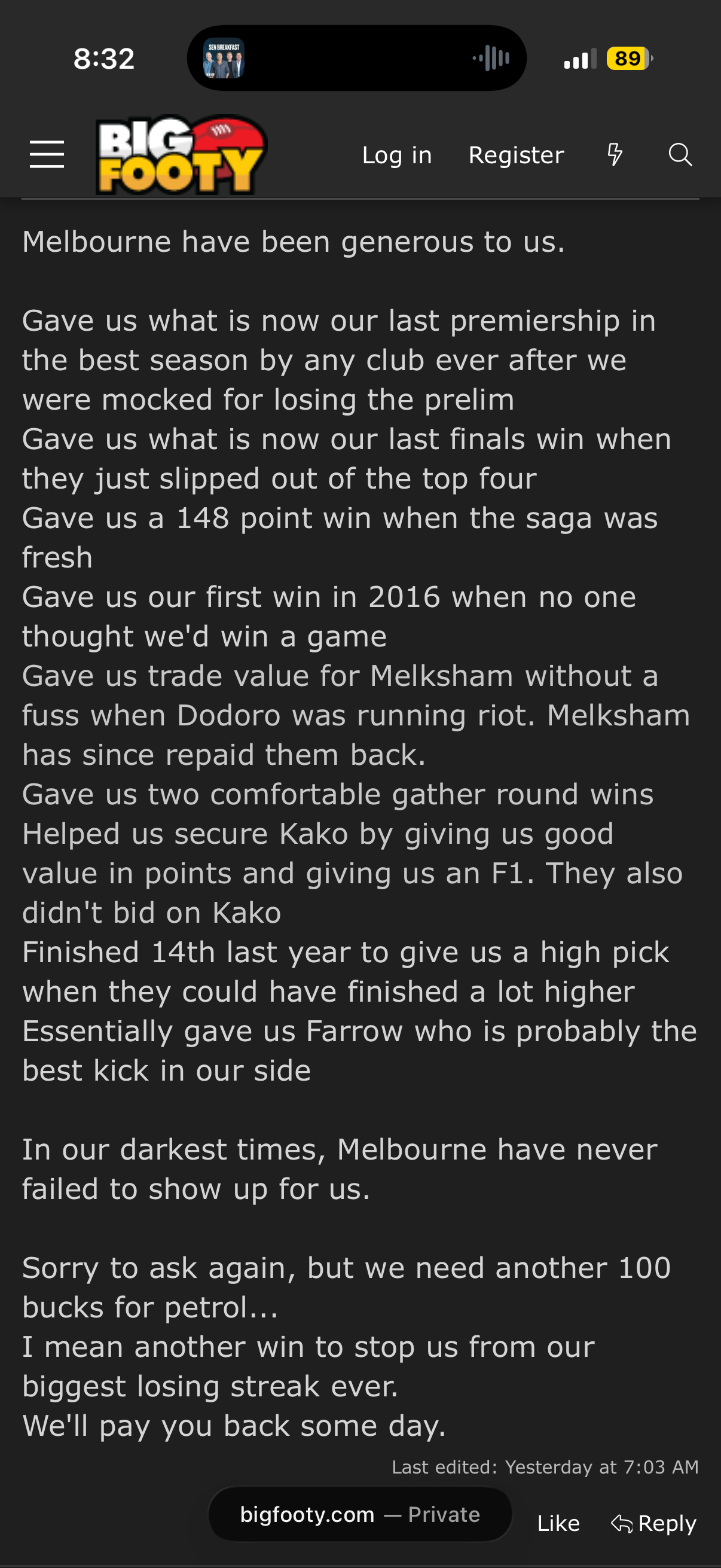 North fans often refer to us as “GoDees” and Richmond fans refer to us as Shemons but I gotta admit, Essendon fans are pretty grounded. Could be because they have been mediocre for 25 years, but they do know how to take the [censored] out of themselves and I found this pretty funny. I don’t despise them as much as I do North, Richmond, Carlton or Collingwood nowadays.