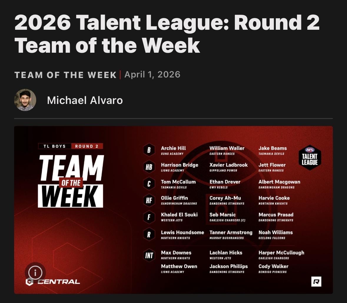 Aussie Rules Rookie Me CentralScouting Notes: 2026 Talent League - Round 2Round 2 of the Talent League saw prospects produce breakout games, and stand up in the absence of key personnel.2026 Talent League: Round 2 Team of the Week A few players of note there starting with grandfather/son Jett Flower (not tied to the MFC) and some Melbourne NGA prospects who may or may not be eligible for the Demons depending on how the rule changes pan out.