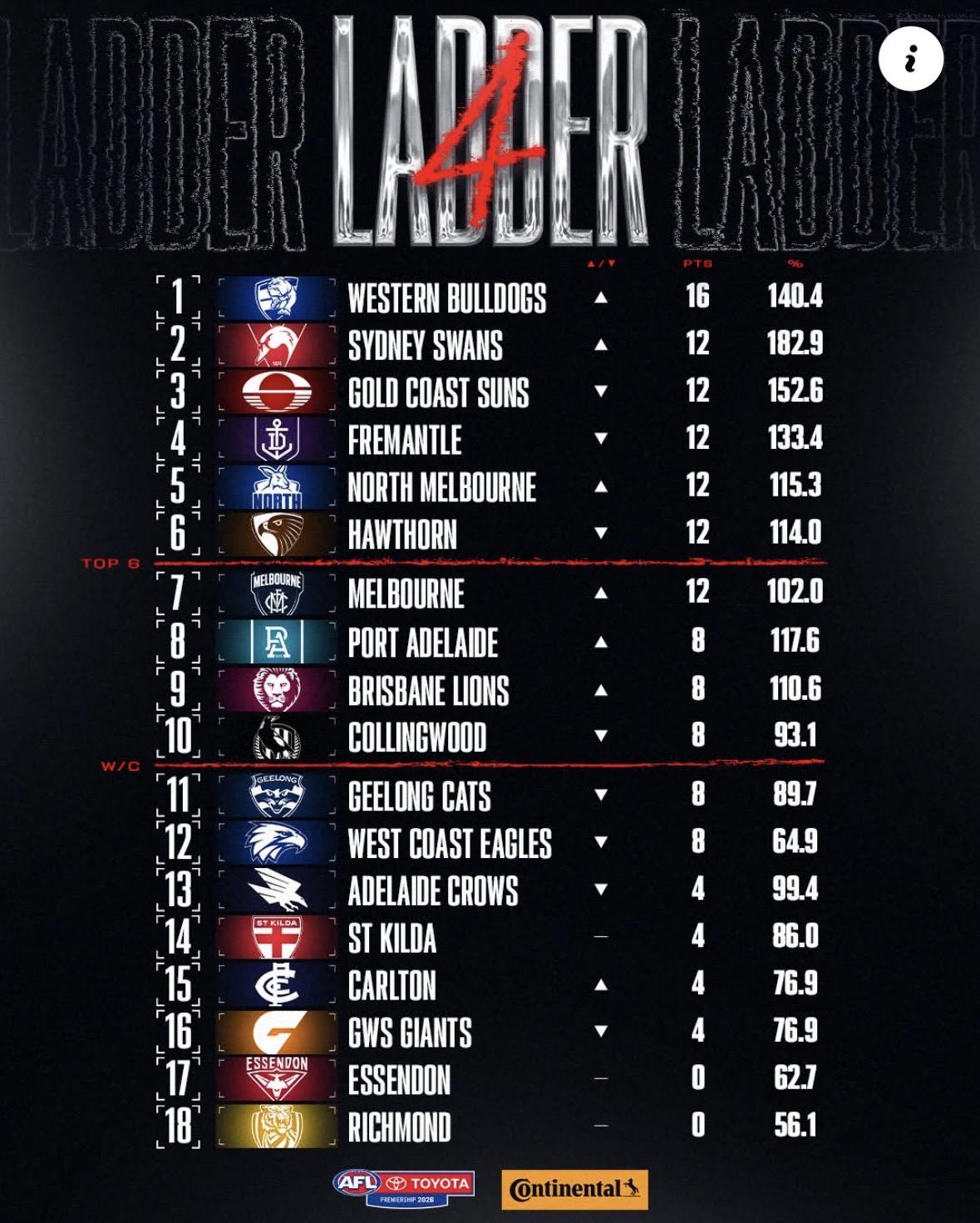 And if you're wondering how things stood on the eve of Gather Round at this time last year (note Gold Coast and Essendon had a game to make up as a result of Cyclone Alfred):- ROUND 4 W L D FOR AGST % PTS HAWTHORN 4 0 0 363 285 127.37 16 BRISBANE LIONS 4 0 0 368 308 119.48 16 GOLD COAST 3 0 0 347 201 172.64 12 GWS GIANTS 3 1 0 377 253 149.01 12 ADELAIDE 3 1 0 500 341 146.63 12 COLLINGWOOD 3 1 0 327 265 123.40 12 ST KILDA 3 1 0 394 351 112.25 12 GEELONG 2 2 0 384 283 135.69 8 SYDNEY SWANS 2 2 0 343 299 114.72 8 WESTERN BULLDOGS 2 2 0 347 345 100.58 8 FREMANTLE 2 2 0 337 364 92.58 8 PORT ADELAIDE 1 3 0 317 365 86.85 4 NORTH MELBOURNE 1 3 0 352 410 85.85 4 ESSENDON 1 2 0 257 332 77.41 4 RICHMOND 1 3 0 293 462 63.42 4 CARLTON 0 4 0 250 308 81.17 0 MELBOURNE 0 4 0 248 407 60.93 0 WEST COAST 0 4 0 243 468 51.92 0