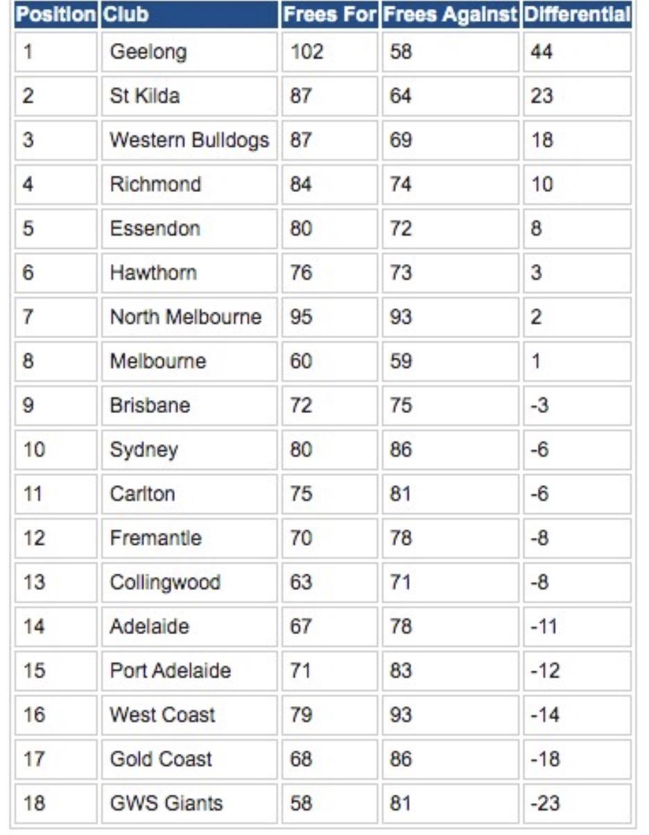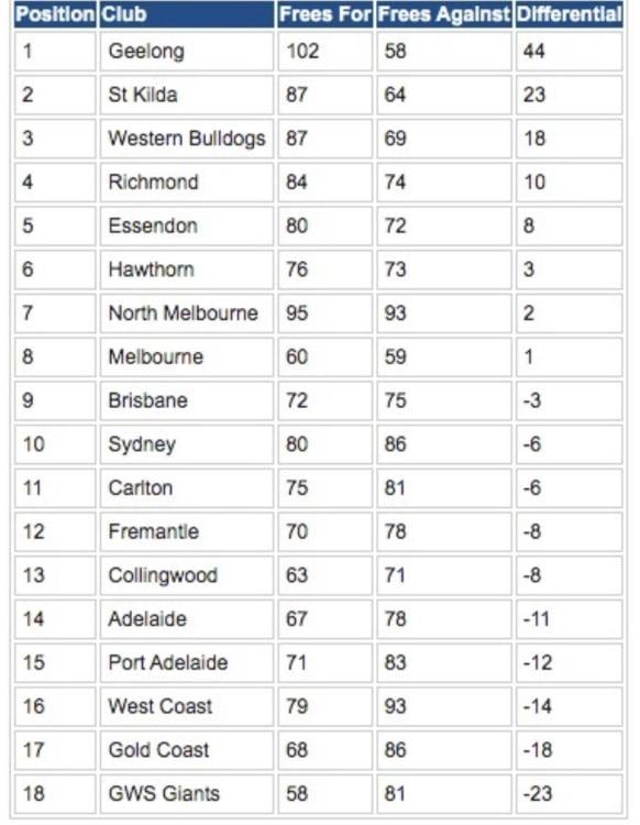 Synopsis: Best differentials 1 - Geelong (+44) 2 - St Kilda (+23) 3 - Western Bulldogs (+18) 4 - Richmond (+10) 5 - Essendon (+8) Worst differentials 1 - GWS Giants (-23) 2 - Gold Coast (-18) 3 - West Coast (-14) 4 - Port Adelaide (-12) 5 - Adelaide (-11) Most frees for 1 - Geelong (102) 2 - North Melbourne (95) Eq.3 - St Kilda & Western Bulldogs (87) 5 - Richmond (84) Best differentials 1 - Geelong (+44) 2 - St Kilda (+23) 3 - Western Bulldogs (+18) 4 - Richmond (+10) 5 - Essendon (+8) Worst differentials 1 - GWS Giants (-23) 2 - Gold Coast (-18) 3 - West Coast (-14) 4 - Port Adelaide (-12) 5 - Adelaide (-11) Most frees for 1 - Geelong (102) 2 - North Melbourne (95) Eq.3 - St Kilda & Western Bulldogs (87) 5 - Richmond (84) Best differentials 1 - Geelong (+44) 2 - St Kilda (+23) 3 - Western Bulldogs (+18) 4 - Richmond (+10) 5 - Essendon (+8) Worst differentials 1 - GWS Giants (-23) 2 - Gold Coast (-18) 3 - West Coast (-14) 4 - Port Adelaide (-12) 5 - Adelaide (-11) Most frees for 1 - Geelong (102) 2 - North Melbourne (95) Eq.3 - St Kilda & Western Bulldogs (87) 5 - Richmond (84) Least frees for 1 - GWS Giants (58) 2 - Melbourne (60) 3 - Collingwood (63) 4 - Adelaide (67) 5 - Gold Coast (68) Most frees against Eq.1 - North Melbourne & West Coast (93) Eq.3 - Sydney & Gold Coast (86) 5 - Port Adelaide (83) Least frees against 1 - Geelong (58) 2 - Melbourne (59) 3 - St Kilda (64) 4 - Western Bulldogs (69) 5 - Collingwood (71) The 2026 Free Kick Ladder - Round 4 Geelong (+44) has had four games with free kick differentials of +9 or more to comfortably sit on top of the standings. The Cats have received 102 frees and given away only 58. St Kilda (+23) sit second but are +21 behind the Cats, while the Western Bulldogs (+18) are third just clear of Richmond (+10) who have often been at the other end of the FK Ladder. As mentioned earlier, Vic teams make up the top eight with Essendon (+8), Hawthorn (+3), North Melbourne (+2)and Melbourne (+1) all with positive differentials. Down the bottom is poor old GWS (-23)who finished second bottom last year. It's back to regular programming for a Dimma-coached team with Gold Coast (-18) second last, then West Coast (-14) third bottom after finishing last year in 15th on the FK Ladder SA pair Port Adelaide (-12) and Adelaide (-11) make up the bottom five. The eight interstate clubs all have negative differentials. Make of that what you will. Brisbane (-3), Sydney (-6), Carlton (-6), Fremantle (-8) and Collingwood (-8) make up the middle table but all have differentials in the red.