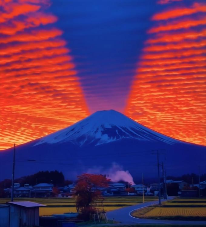 Happy New Year to Demonlanders … I bring you an omen in the form of this vision of the sky over Mount Fuji in Japan literally split in two for the first sunrise of 2026. That dark path is Fuji casting a massive shadow against the glowing atmosphere, producing its own red and blue energy for the 2026.