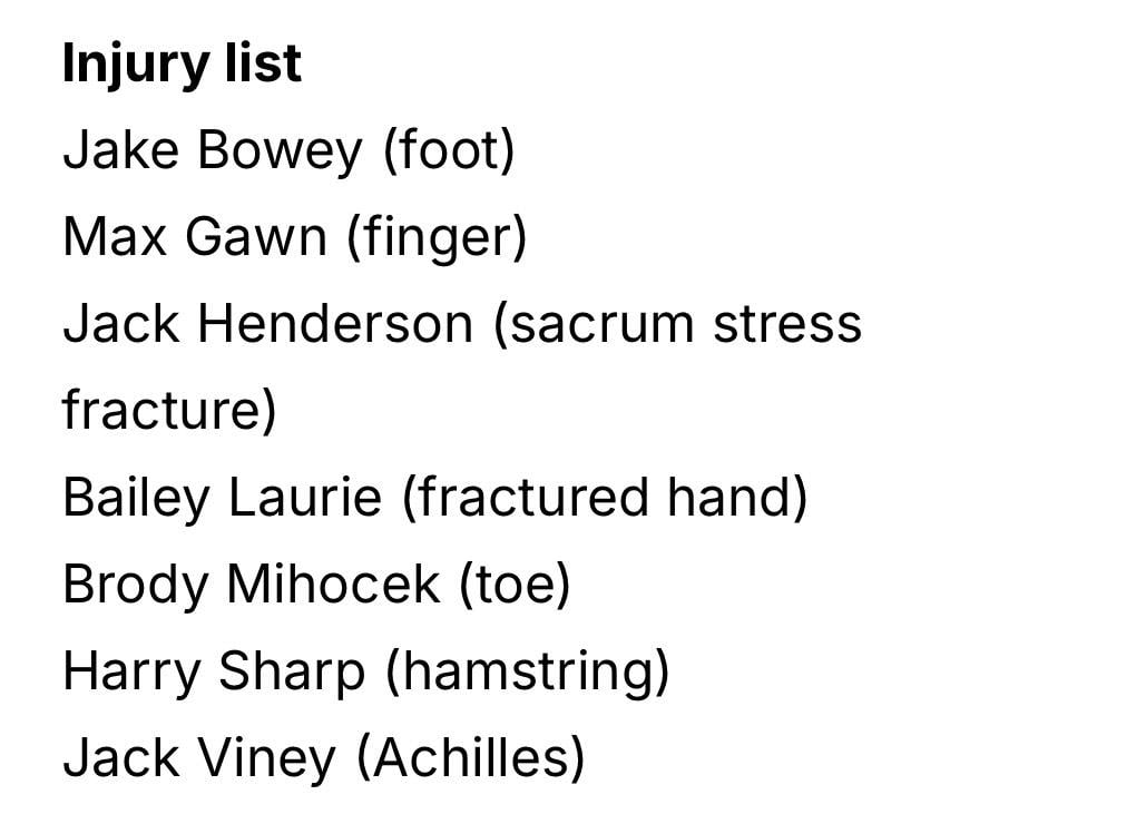 The AFL website has come out with an injury ‘update’ that didn’t take much time to get out of date. You can add Kalani White (glandular fever) to the list at the bottom along with a handful of others who have been undergoing modified training programs that indicate that they are nowhere near optimal fitness as the start of the season approaches. Fingers crossed for today and tomorrow.- Rolling Weekly Best 23