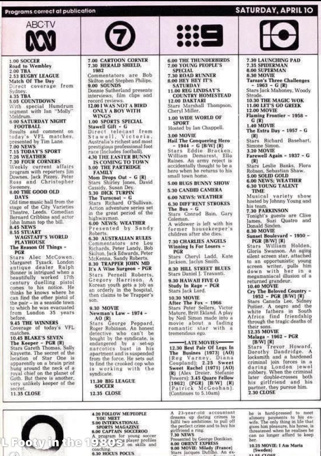 Something a little bit different from 10 April 1982 โฆ exactly 44 years ago today. The TV guide and look at the lineup of household names talking about the footy.
