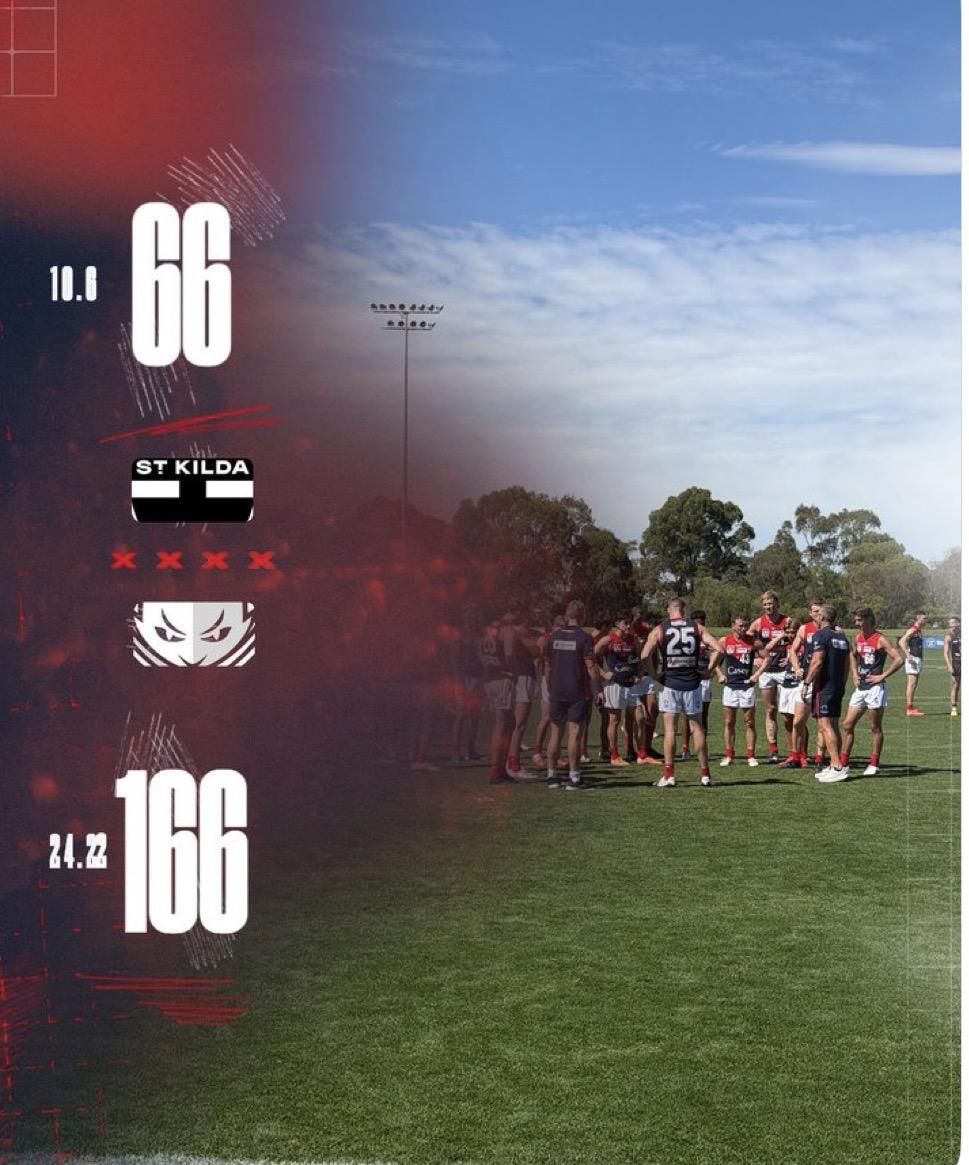 And Xavier Taylor comes out of defence and goal to make it 166 to 66 and itโs a 100 point ball game. CASEY DEMONS 3.4.22 8.10.58 16.14.110 24.22.166 ST KILDA VFL 1.1.7 5.3.33 10.6.66 10.6.66 10.6.66 GOALS CASEY DEMONS Melksham 4 Laurie Sinnema 3 Bonner Bowden Cross Matthews Scapin 2 Mentha Jr Onley Pippicelli Taylor