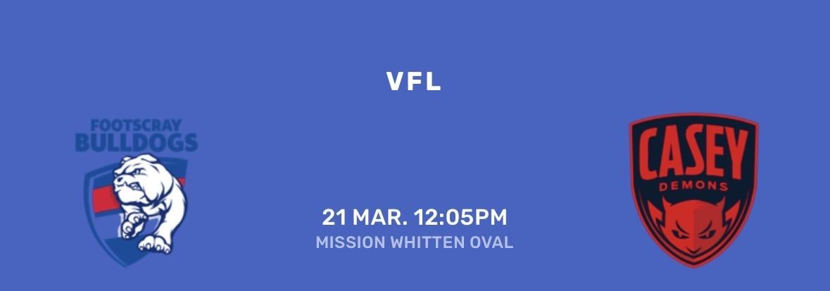 FOOTSCRAY BULLDOGS vs CASEY DEMONSSaturday 21 March, 12:05pm, Mission Whitten Oval FOOTSCRAY BULLDOGS B: J. Busslinger (5), R. Gardner (43), N. Coffield (17) HB: L. Cleary (36), L. Emmett (25), L. Carmichael (2) C: H. Gallagher (12), A. Treloar (1), H. Hewitt (72) HF: J. Dolan (26), L. McNeil (30), A. Jones (32) F: C. Smith (55), W. Darcy (15), W. Lewis (28) R: L. Smith (40), L. Kennedy (35), D. Orgill (50) INT: F. Valpied (53), C. Craig-Peters (61), B. Crofts (54), J. Billings (51), G. Saunders (79) 23rd Player: G. Saunders (79) EMG: C. Hargraves (52), L. Muratore (56), L. Ramshaw (60), B. Young (67) CASEY DEMONS B: W. Lual (74), J. Adams (26), A. Moniz-Wakefield (45) HB: R. Mentha Jnr (39), X. Taylor (19), L. Lual (58) C: T. Sinnema (61), L. D'Angelo (56), E. Stanley (64) HF: J. Henderson (43), R. Onley (40), P. Cross (41) F: T. Matthews (20), B. Bowden (78), J. Melksham (18) R: M. Heath (27), R. Bonner (52), B. Laurie (16) INT: J. Craven (75), L. Cheffers (72), N. Pipicelli (70), T. Sruk (53), O. Berry (38) 23rd Player: L. Cheffers (72) EMG: J. Gatt (76), J. Scapin (66), B. Laplanche (68) Head-to-head: Footscray 11-5; At Mission Whitten Oval: Footscray 4-1; Streak: Footscray 4; Last time: Footscray 12.8 (80) def Casey Demons 9.8 (62) โ Round 7, 2025, Mission Whitten Oval