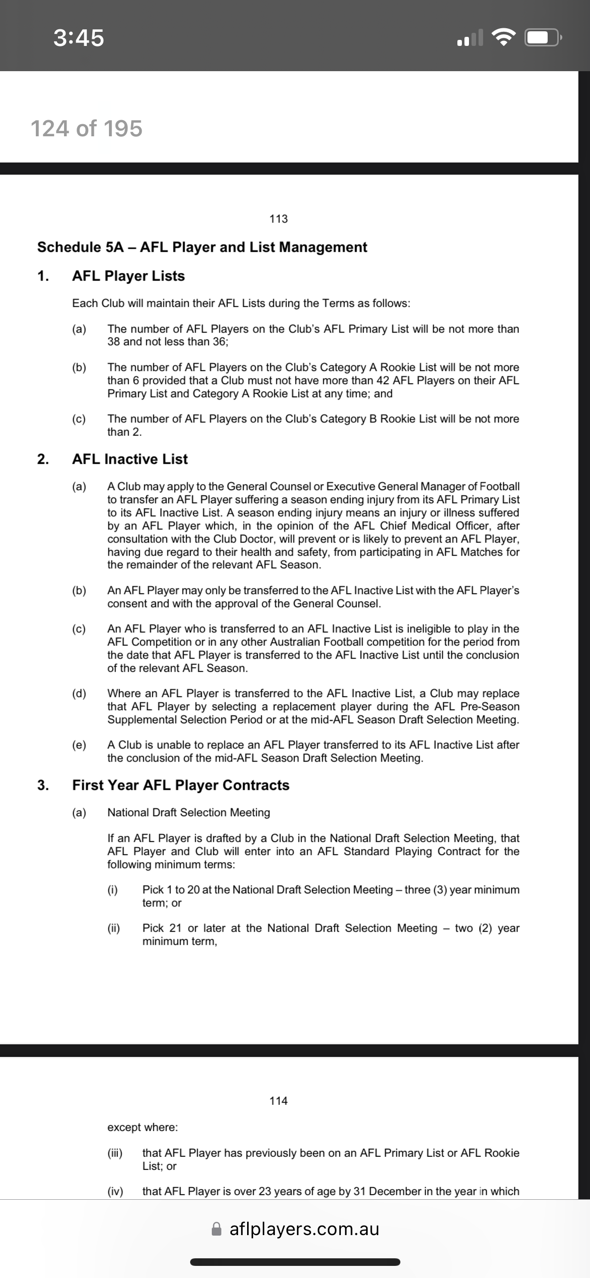 LTI is an outdated term, it doesn’t exist now in the AFL list management rules. Inactive List is the updated term used since the SSP/mid season draft was introduced. From the AFL CBA 2023- 2027 Schedule 5A - AFL Player and List Management 1. AFL Player Lists Each Club will maintain their AFL Lists during the Terms as follows: (a) Thand mot less fra layers on the Club's AFL Primary List will be not more than (b) The number of AFL Players on the Club's Category A Rookie List will be not mor himany Listand Cata or A Rokie Lavat any time: A FL Players on their AF (c) Than Lumber of AFL Players on the Club's Calegory B Rookie Lit will be not more 2. AFL Inactive List (a) A Club may apply to the General Counsel or Executive General Manager of Football to transfer an AFL Player suffering a season ending injury from its AFL Primary List to its AFL Inactive List. A season ending injury means an injury or illness suffered by an AFL Player which, in the opinion of the AFL Chief Medical Officer, after consultation with the Club Doctor, will prevent or is likely to prevent an AFL Player, having due regard to their health and safety, from participating in AFL Matches for the remainder of the relevant AFL Season. (b) An AFL Player may only be transferred to the AFL Inactive List with the AFL Player's consent and with the approval of the General Counsel. (c) An AFL Player who is transferred to an AFL Inactive List is ineligible to play in the AFL Competition or in any other Australian Football competition for the period from the date that AFL Player is transferred to the AFL Inactive List until the conclusion of the relevant AFL Season. (d) Where an AFL Player is transferred to the AFL Inactive List, a Club may replace that AFL Player by selecting a replacement player during the AFL Pre-Season Supplemental Selection Period or at the mid-AFL Season Draft Selection Meeting. A Club is unable to replace an AFL Player transferred to its AFL Inactive List after the conclusion of the mid-AFL Season Draft Selection Meeting- Train On Prospects